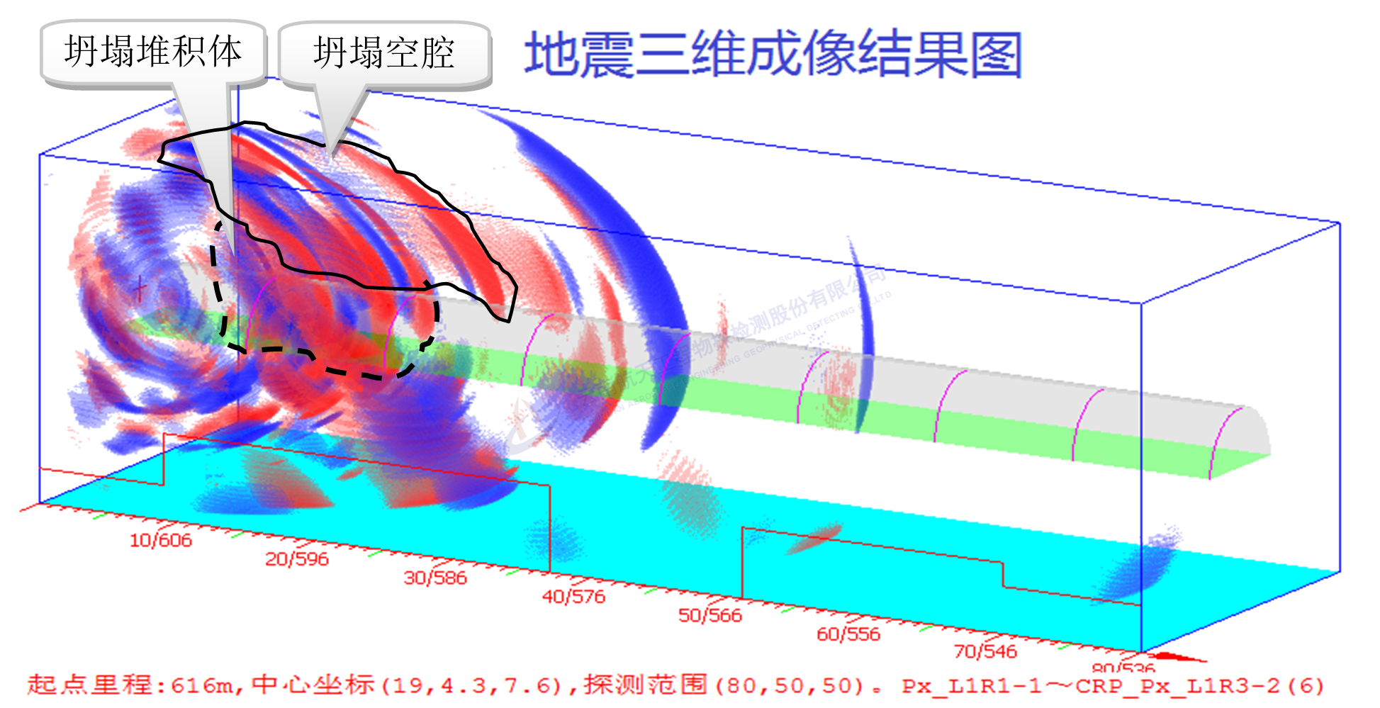 2017年9月,某在建高速公路隧道塌方,我公司利用综合三维超前预报技术探明了洞内坍塌堆积体范围、洞顶坍腔空间三维形态,为救灾、处治提供了重要依据。